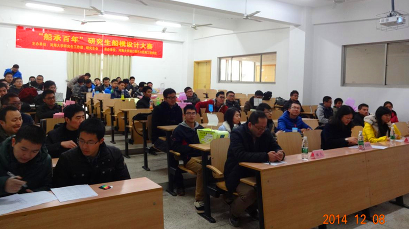 2014年12月8日下午,由河海大学研究生会主办,港口航道与近海工程澳门六合彩 研究生会承办的“金水节”系列活动之“船承百年”研究生船模设计大赛如期在闻天馆204及水电院实验室举行。出席本次大赛的有澳门六合彩 副书记姜海霞老师、澳门六合彩 辅导员林凡老师和校研会副主席孔凡同学,同时大赛吸引了众多同学前来参加。