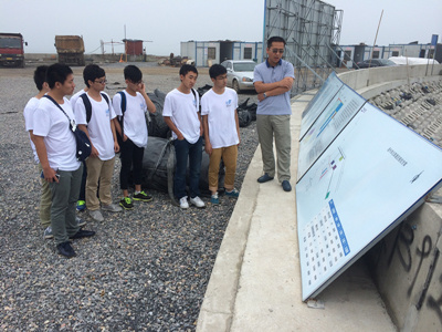 下午,队员们驱车前往通州湾沿海开发项目的施工现场。海堤一直延伸到大海深处,经过一个多小时的颠簸,大家终于到达了施工现场。下车后,两位带路的校友详细地为队员们描绘了整个沿海开发工程的四期工程。他们说,这是一个宏伟的项目,任重而道远,可能不是一代人能够完成的。但是,队员们觉得,只要有河海校友和其他杰出人才在这里扎根,有艰苦朴素、实事求是、严格要求、勇于探索的校训精神在这里代代相传,这宏伟的工程总有完成的一天。队员们参观了一期工程5万吨级港口的建设的现场,身处这个艰苦的环境,环顾四周,没有金色的沙滩,没有和煦的海风,有的只是破旧的板房,只是海浪拍打岸边的声音。虽然环境艰苦,但是工程的建设者们不会退却,不会放弃“中国梦”。