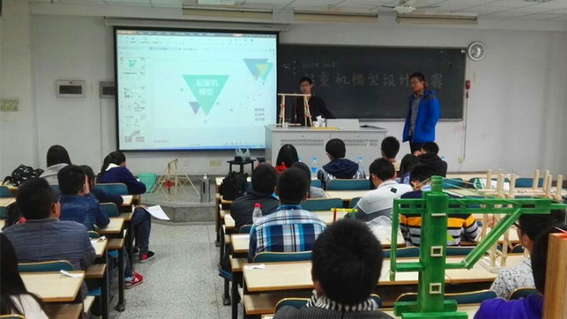 两点半,比赛正式开始,各组选手依次走上讲台,讲述自己的创意思路。从选手们极富感染力的答辩中可以看出,每一位选手都为自己的模型付出了无数的心血,经过巧妙的设计构思和数次的推翻重来,将模型从最初的雏形,渐渐磨砺出最后的佳作。 其中最值得称道的是大禹院王旭组的作品, ppt上列出的物理公式及现场实践的结果令同学们钦佩他们的缜密。港航院孙彩淦组的作品也毫不逊色。细节处十分精密,缝隙连接处堪称完美。