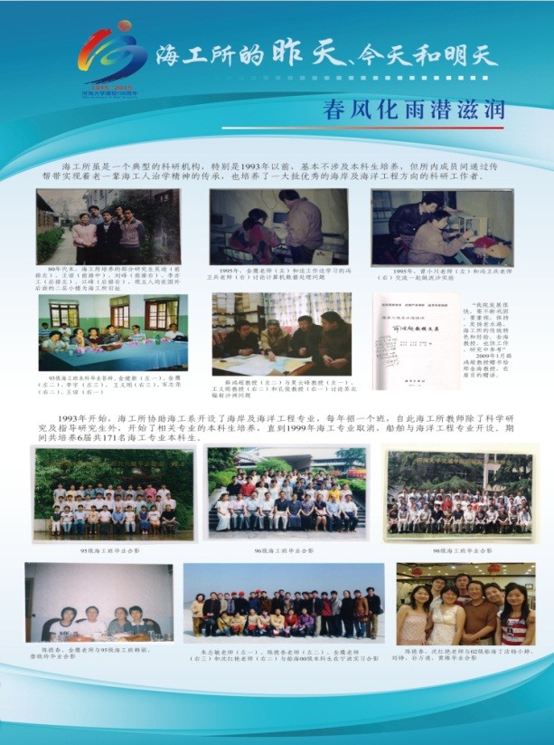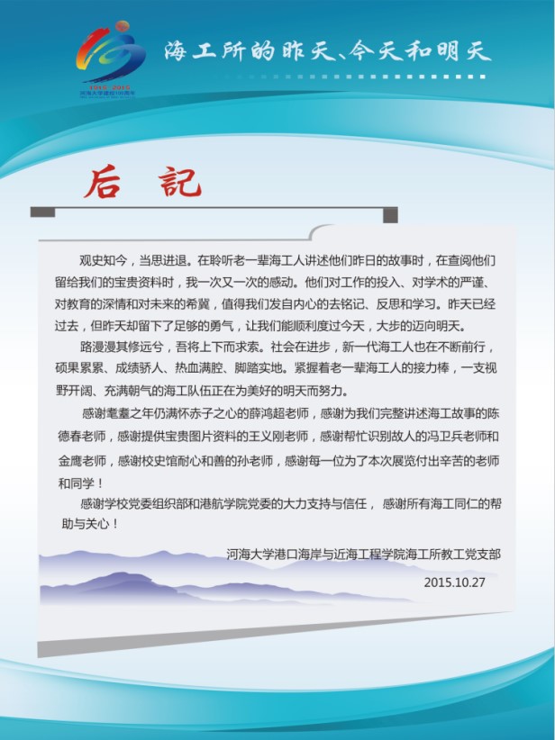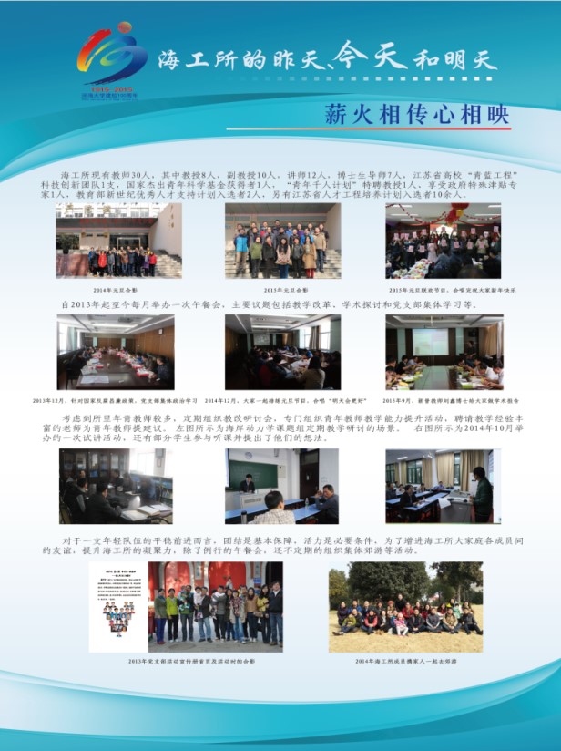 2015年10月25日至31日,澳门六合彩 海工党支部在河海大学校党委组织部和澳门六合彩 党委的共同支持下,举办了主题为“海工的昨天、今天和明天”的文化展活动。展览过程中,除了海工党支部全体党员专门组织了观展和学习活动外,学校的师生员工以及校庆期间返校的校友们等约三百余人次参与了该活动。本次展览活动旨在通过对海工辉煌历史的梳理,提升海工所全体教师的集体荣誉感;通过对海工文化精神的凝练,实现海工精神的传承与可持续发展;通过对海工过去成绩、现在工作以及未来愿景的展示,促进海工人的自我认可,树立着海工精神在全院以及全校文化建设中的模范形象。