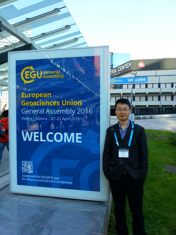 2016年4月19日至23日期间,澳门六合彩app 陶爱峰副教授参加了在奥地利维也纳举办的EGU(European Geosciences Union)2016年国际学术年会。会议期间,陶爱峰副教授在NH5.2自然灾害分会场的极端海洋与非线性波浪方向专题组做了题为“Preliminary investigation on the relation between maximum wave height and wave spectra”的学术报告,并作为优秀学生海报和演讲奖(Outstanding Student Poster and PICO (OSPP) Award)的评选专家参与了该奖的评选活动。