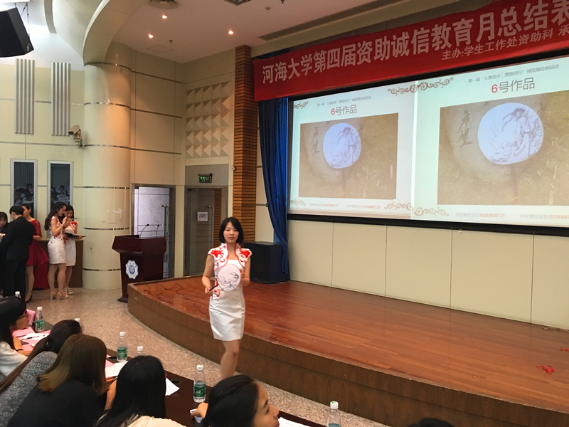 2016年6月7日中午,由河海大学学生处主办,澳门六合彩 承办的河海大学第一届“上善若水,携扇同行”诚信扇绘制活动在江宁会议中心成功进行了作品展示。各澳门六合彩 负责诚信资助的老师和同学代表出席了本次活动,积极为作品投票。