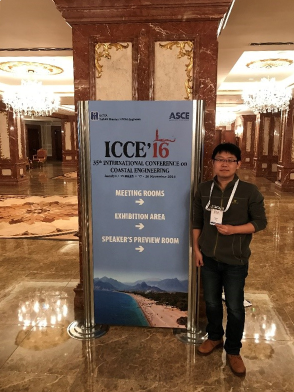 2016年11月17日至22日,澳门六合彩app 隋倜倜博士参加了在土耳其安塔利亚召开的第35届海岸工程国际会议(International Conference on Coastal Engineering)。隋倜倜博士做了题为“Effects of Pile Displacement on its Surrounding Seabed Response Under 3D Wave Loading”的报告,介绍了自己最新的研究成果,并与国际同行开展广泛交流。