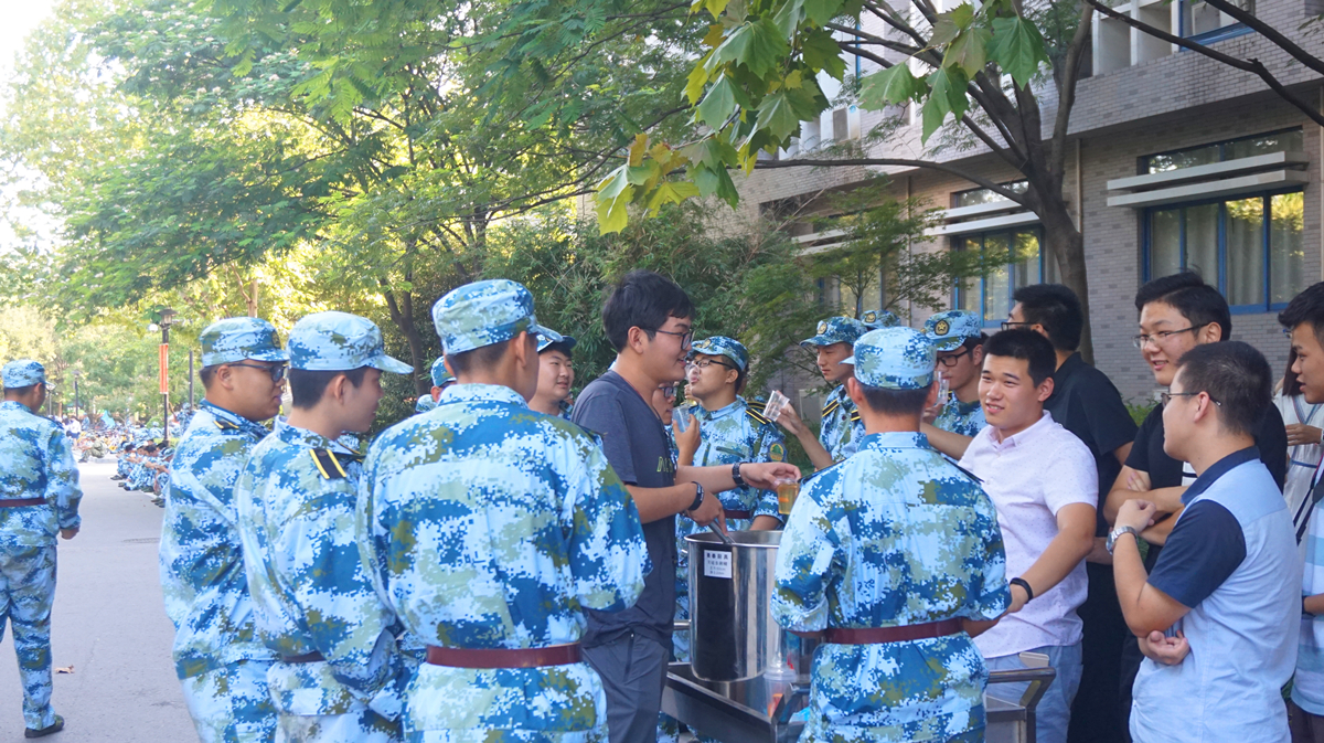 下午四点,送清凉活动正式开始,三位老师和同学们首先来到了女生军训的八连。在教官解散队列后,同学们开始井然有序地排队,接过王玲老师亲自为她们倒好的茶水,队伍长长,情谊绵绵。