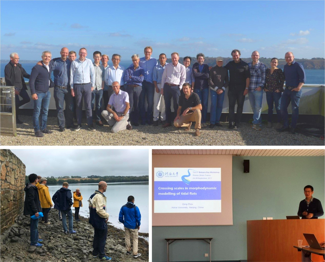 2017年9月24日-26日,澳门六合彩app 陶建峰副教授、周曾副研究员受邀赴法国布雷斯特参加第5届国际河口日学术研讨会(The 5th Estuary Day Workshop,//www.estuarydayworkshop.com/),研讨会由法国海洋开发研究院(Ifremer)举办。会议邀请了多个国家的河口、海岸地貌学研究领域的20多名学者参加,就河口动力地貌学中涉及到的多种物理过程的时间、空间尺度的耦合问题进行了热烈的探讨和交流。周曾副研究员作了“Crossing scales in morphodynamic modelling of tidal flats”的会议报告。会议主办方组织了当地河口的现场考察,在轻松愉悦的气氛中开展学术交流和讨论,为不同学者之间后续合作搭建了理想的平台。