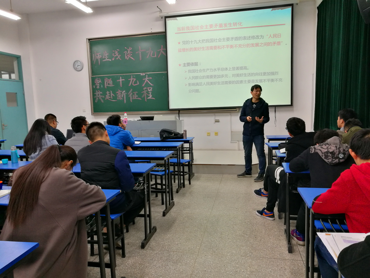 活动开始,陶老师对“新征程”三个字进行了解读,认为党的十九大是一次有划时代意义的大会,她开启了中国梦新的征程。同时,陶老师结合自身成长经历,用生动形象的语言带领大家一起学习了“习近平新时代中国特色社会主义思想”、“五位一体”等重要思想,引导同学们去理解和思考,如何把报告里的精神运用到实际生活实践中。最后,陶老师鼓励大家在生活中要多思考多实践,脚踏实地,不忘初心,共创未来。