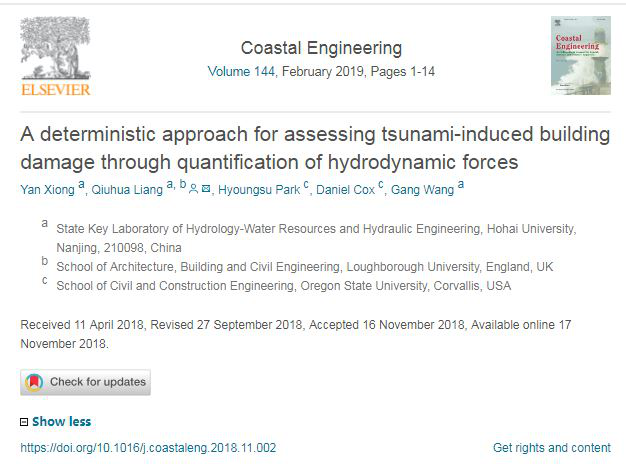 近日,国际海岸、海洋工程类SCI一区期刊《Coastal Engineering》发表梁秋华教授团队熊焱博士研究生的最新研究成果“A deterministic approach for assessing tsunami-induced building damage through quantification of hydrodynamic forces”。