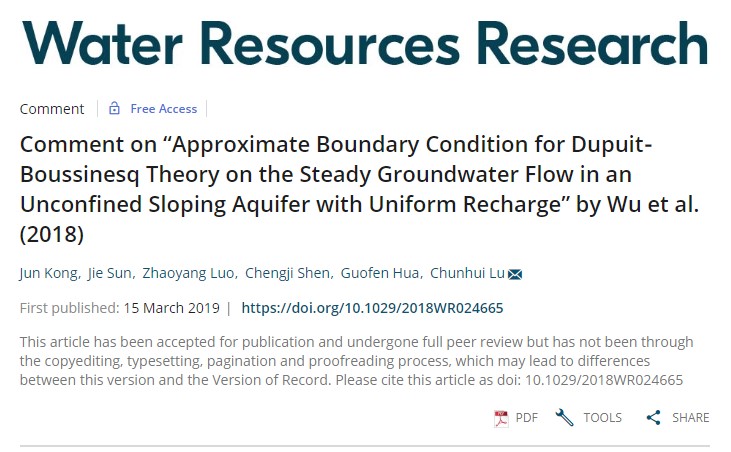 近日,澳门六合彩app 孔俊教授在国际顶级期刊《Water Resources Research》,针对Wu et al. (2018)发表的论文“Approximate Boundary Condition for Dupuit‐Boussinesq Theory on the Steady Groundwater Flow in an Unconfined Sloping Aquifer with Uniform Recharge” 发表评论文章。
