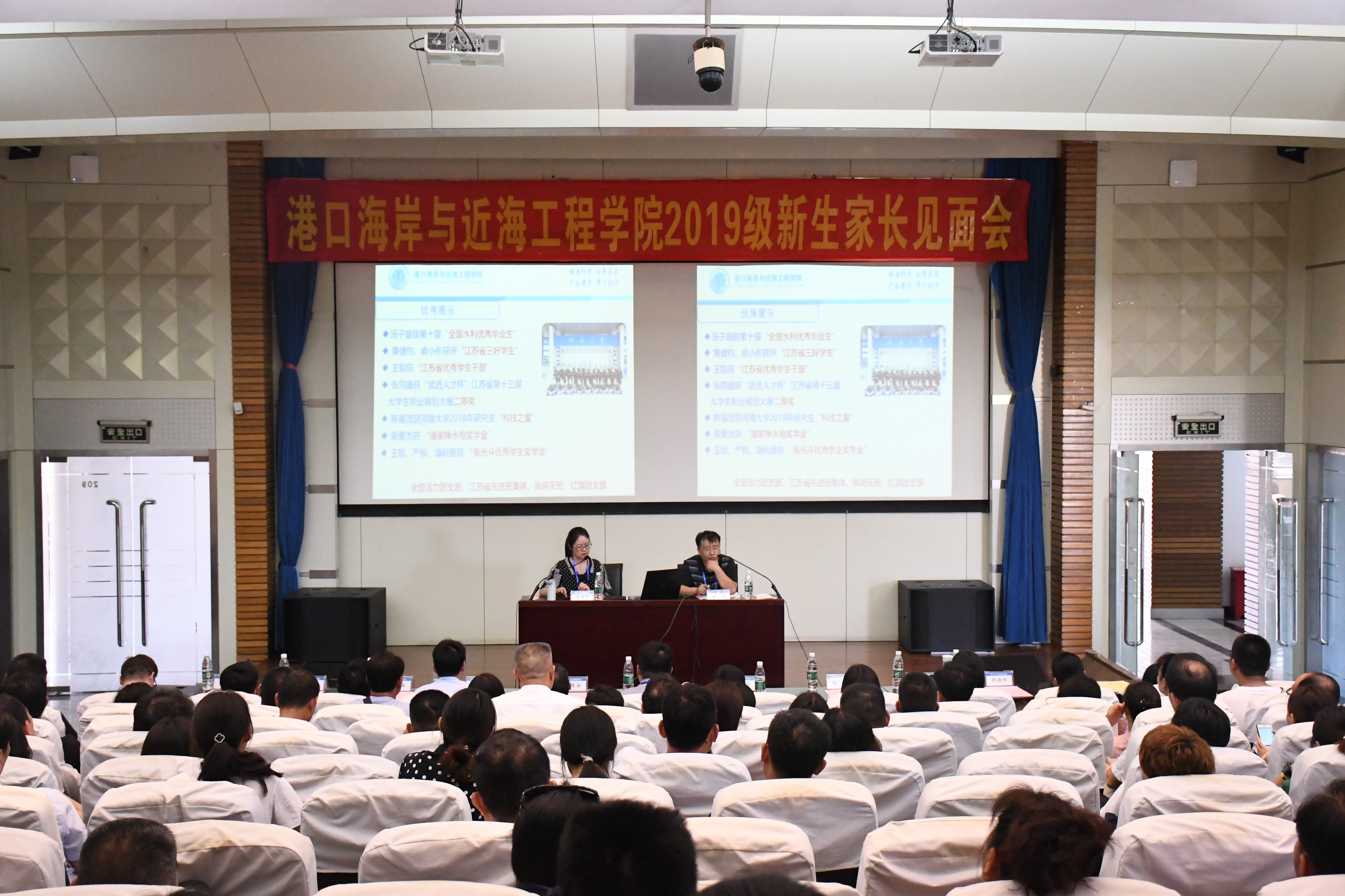 8月24日下午1点半,澳门六合彩 2019级新生家长见面会在江宁校区江宁会议中心举行。港航院副院长张蔚、党委副书记姜海霞、海岸所支部书记陶建峰、2019级各班班导师、本科教学秘书、各年级辅导员出席了此次家长见面会。