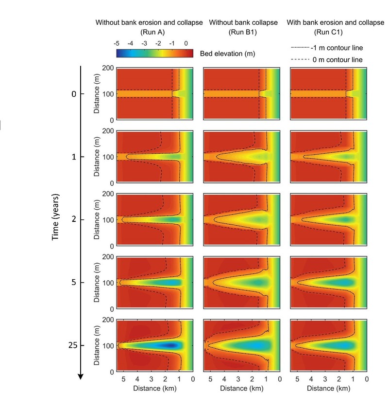 该研究围绕潮滩-潮沟系统演变机制,将潮沟边壁坍塌过程与传统水-沙-地貌过程耦合,探究了坍塌泥沙对潮沟平面、断面形态的影响。模型结果表明,由于坍塌泥沙的掩护效应,平衡时潮沟的宽度变小,断面形态也由凹形转变为凸形。本研究丰富了海岸动力学与泥沙运动力学,对海岸带资源与环境等交叉学科发展具有重要的意义。