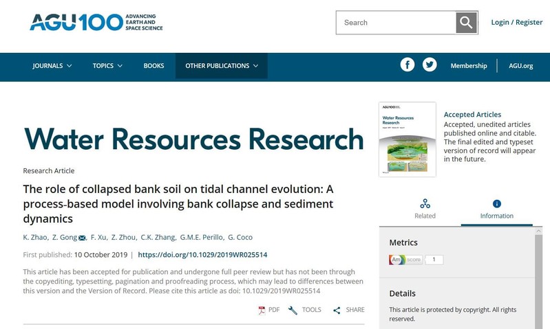 近日,澳门六合彩app 潮滩动力地貌研究团队博士生赵堃在国际权威期刊《Water Resource Research》(一区Top, 2018年影响因子4.36)上发表了题为“The role of collapsed bank soil on tidal channel evolution: A process-based model involving bank collapse and sediment dynamics”的学术论文,是继该团队在知名刊物《Geomorphology》发表岸壁坍塌对潮沟拓宽贡献研究后的又一突破。论文第一作者为澳门六合彩app 赵堃博士生,合作作者包括龚政教授、周曾教授、张长宽教授,以及华东师范大学徐凡博士、阿根廷海洋研究所G. M. E. Perillo教授和新西兰奥克兰大学Giovanni Coco副教授。