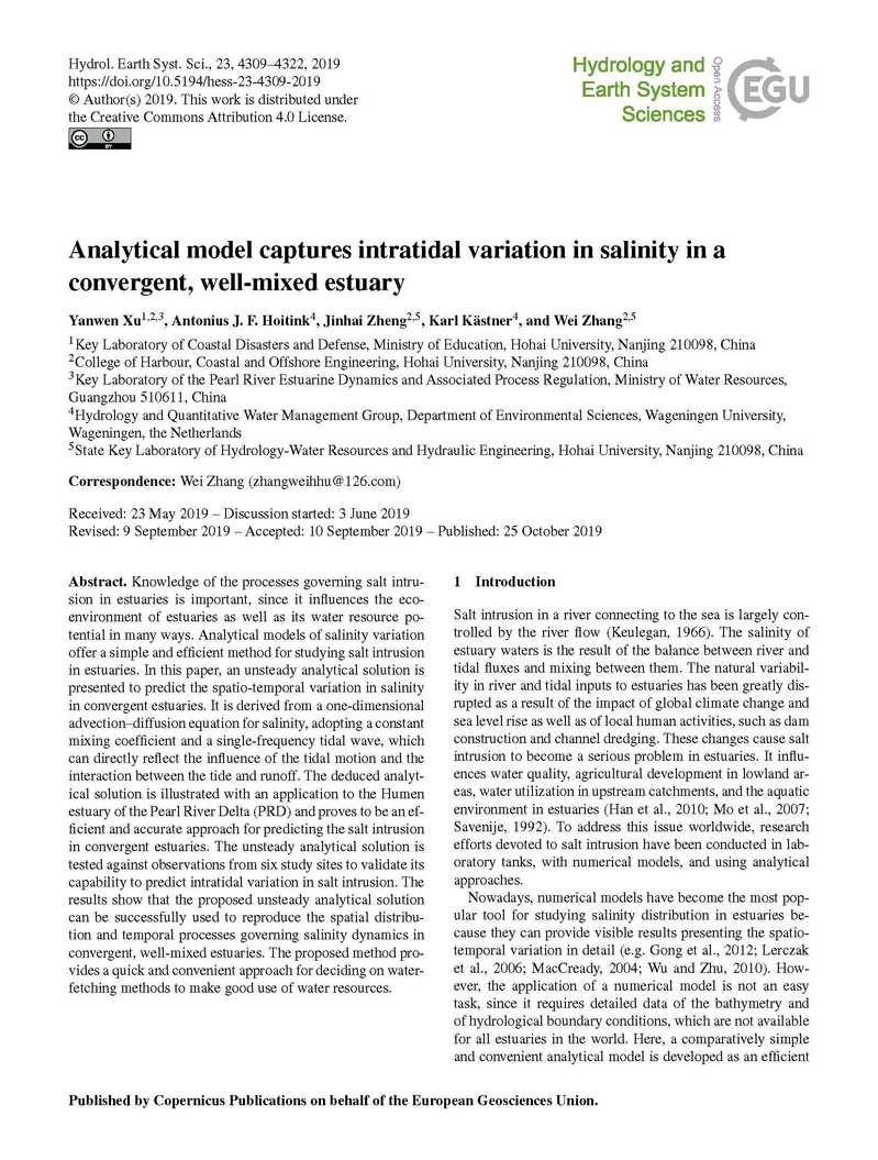 近日,澳门六合彩app 海岸及海洋工程研究所徐龑文博士后和张蔚教授(通讯作者)在中科院一区国际学术期刊《Hydrology and Earth System Sciences》上发表高质量研究论文“Analytical model captures intratidal variation in salinity in a convergent, well-mixed estuary”。此研究是由澳门六合彩app 张蔚教授研究团队领衔,与荷兰瓦赫宁根大学环境科学系Hydrology and Quantitative Water Management Group荷兰和德国学者组成的研究团队合作完成。