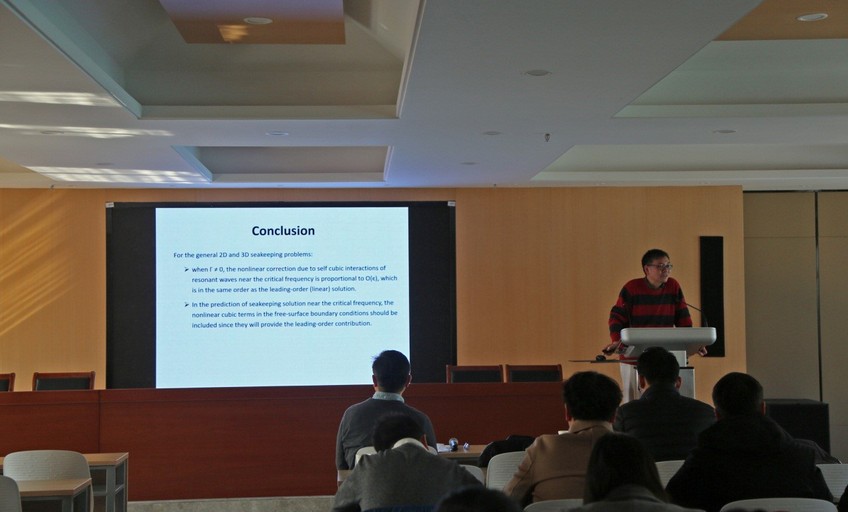 美国麻省理工澳门六合彩 机械工程系海洋工程研究中心刘玉明教授作了题为“Seakeeping Solution Behavior near the Critical Frequency(临近频率附近的船舶耐波性研究)”的学术报告。刘教授结合自己研究课题介绍了需要使用非线性方法求解水动力问题的原因,对使用的数学方法、边界条件给予了详细的讲解。并且,利用该方法对完全淹没的圆柱和临界频率附件的船舶运动情况进行了展示。