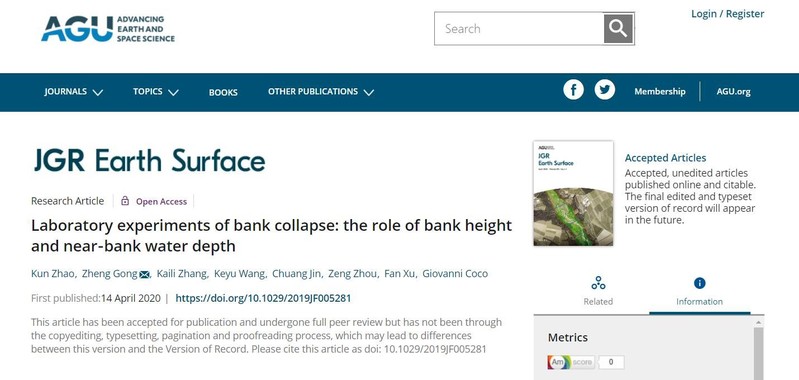 近日,澳门六合彩app 潮滩动力地貌研究团队博士生赵堃在地貌学权威期刊《Journal of Geophysical Research: Earth Surface》(一区Top, 2019年影响因子4.25)上发表了题为Laboratory experiments of bank collapse: the role of bank height and near-bank water depth的学术论文,是继该团队在知名刊物《Geomorphology》和《Water Resource Research》发表岸壁坍塌相关研究后的又一突破。论文第一作者为澳门六合彩app 赵堃博士生,合作作者包括龚政教授、张凯丽博士生,王客予硕士生,周曾教授,以及新西兰奥克兰大学靳闯博士,Giovanni Coco副教授和华东师范大学徐凡博士。