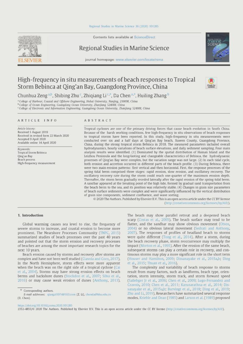 近日,澳门六合彩app 陈达教授指导的博士研究生曾春华在《Regional Studies in Marine Science》(二区)上发表了题为“High-frequency in situ measurements of beach responses to Tropical Storm Bebinca at Qing’an Bay, Guangdong Province, China”的学术论文。
