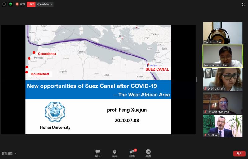 封学军教授的演讲主题为:New opportunities of Suez Canal after COVID-19—The West African Area,指出了新型冠状肺炎疫情在给苏伊士运河带来巨大挑战的同时,也带来了在船舶大型化背景下建设远东-欧洲航线针对西非区域发展的转运枢纽、港航基础设施转型升级以及加快人工智能、区块链、5G和无人驾驶船舶等新科技在航运业研发和应用等机遇。伊斯梅尔校长在会议总结中高度赞扬了河海大学在国际航运发展中发挥的重要作用,并对封教授在疫情期间对阿盟、特别是苏伊士运河的发展的关注以及精彩的演讲多次表达感谢。中国驻亚历山大总领馆也对封学军教授的演讲给予了高度评价,认为演讲的内容对非洲发展具有重要指导作用,从科学研究的高度很好地宣传和推广了国家“一带一路”倡议,并专门给河海大学发送感谢信。