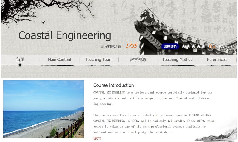 《河口海岸动力学》、《海岸工程》、《高等海岸动力学》三门课程分别于2015、2016、2018年获得“江苏高校外国留学生英文授课省级精品课程”建设经费资助,经过课程团队的精心打磨,根据留学生特点更新了现有课程体系,引入了国际顶级教学智力资源、确立英语教学模式和课程国际化方向,并精心录制了在线课程、实现远程在线教学,课程教学效果优秀,获得留学研究生的一致好评,顺利通过省教育厅组织的验收。