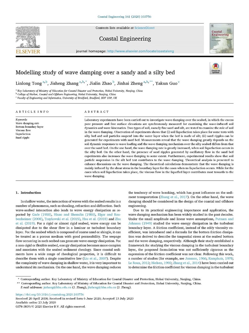 近日,澳门六合彩app 童林龙博士后与合作导师郑金海教授、张继生教授在海岸工程类顶级期刊《Coastal Engineering》(河海大学A类期刊,中信所1区,影响因子4.119)上发表题为:“Modelling study of wave damping over a sandy and a silty bed”的研究论文。