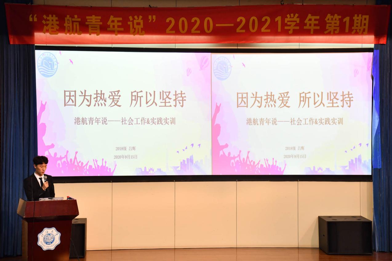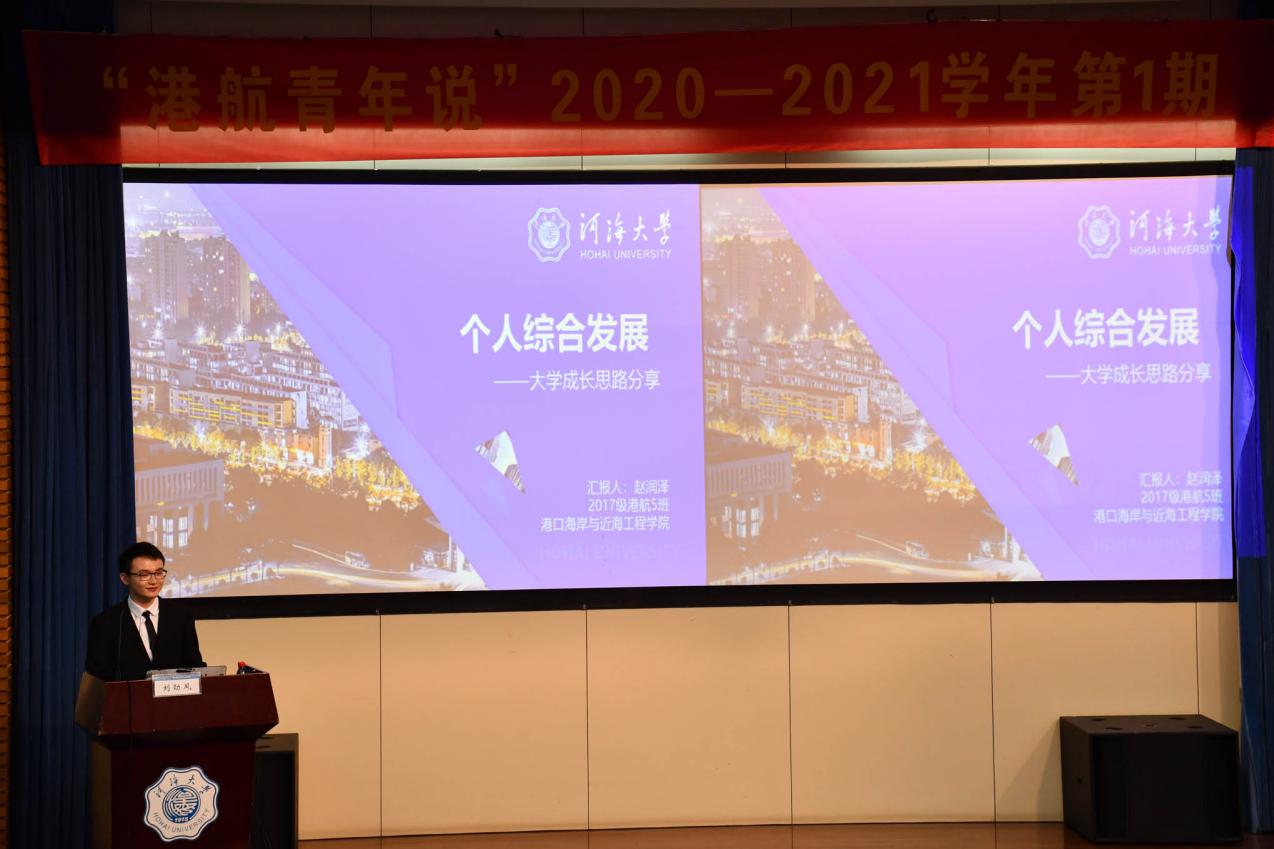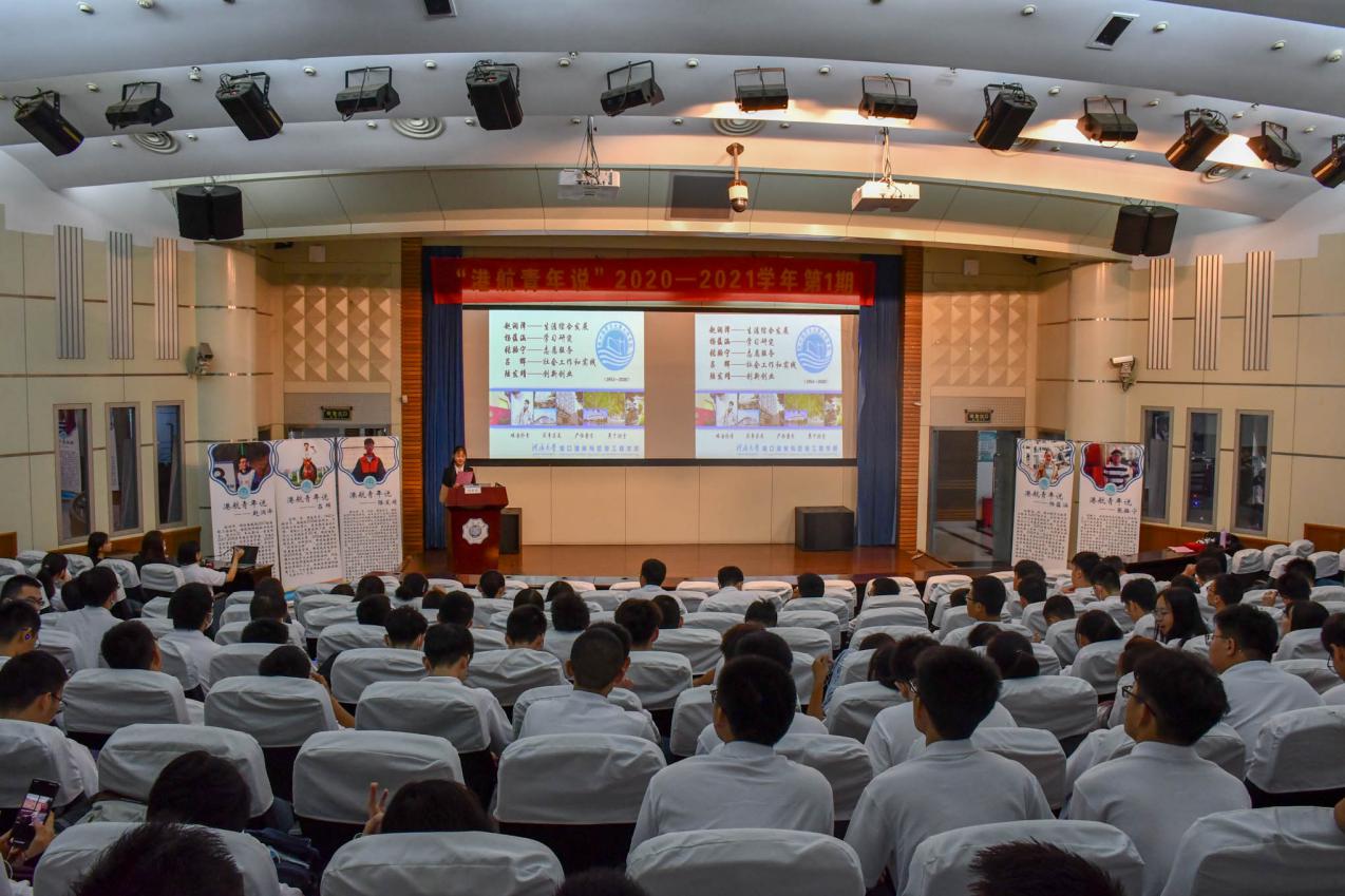 2020年9月15日下午,澳门六合彩 在江宁会议中心二楼报告厅举行2020—2021学年第1期“港航青年说”。此次讲座邀请到澳门六合彩 2017级本科生赵润泽、杨蕴涵、陆发靖、张骆宁以及2018级本科生吕辉,就综合发展、学习研究、创新创业、志愿服务和社会工作等方面向2020级新生进行经验分享。
