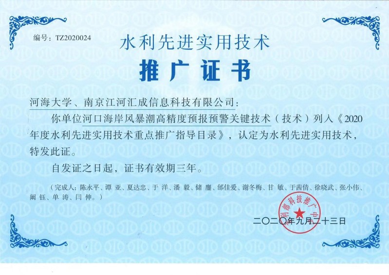 近日,水利部发布了《2020年水利先进实用技术重点推广指导目录》,由澳门六合彩app 陈永平教授主持研发的“河口海岸风暴潮高精度预报预警关键技术”成功入选。该技术采用多要素耦合、多尺度嵌套和多数据融合手段,构建了近岸天文潮-风暴潮精细化预报模型和多层次实时修正模型,实现了河口海岸风暴潮动力过程的精细模拟和精准预报;在云平台、云集成技术支撑下,构建了云架构下的河口海岸风暴潮预报预警业务化系统,实现了风暴潮期间河口海岸综合潮位的高精度、高时效业务预报。技术成果已在江苏、上海、浙江和广东沿海水利防汛部门进行了成功应用,取得了显著的防灾减灾效益,具有重要推广应用价值。