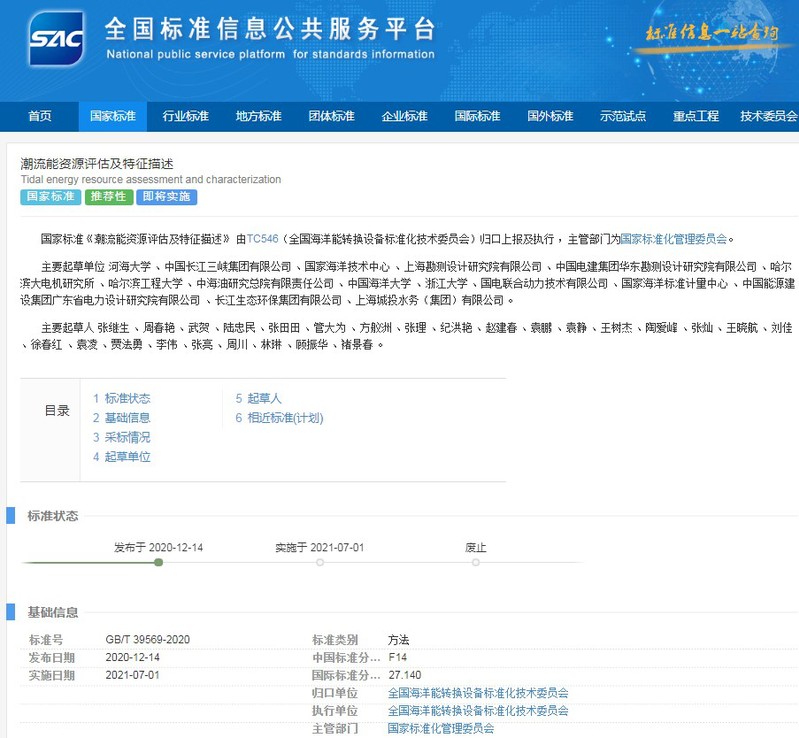 2020年12月14日,澳门六合彩app 张继生教授主编的国家标准《潮流能资源评估及特征描述》 (GB/T 39569-2020)由国家标准化管理委员会正式发布,于2021年7月1日起实施。