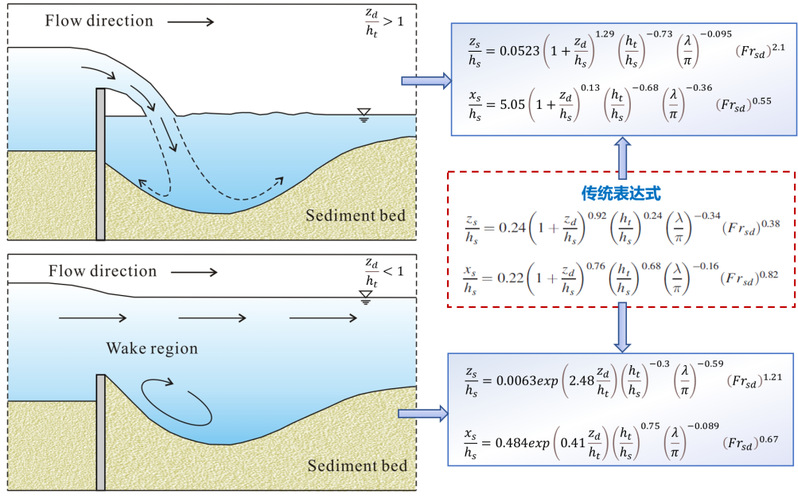 2022年1月,美国土木工程师协会公布了2022年度J. C. Stevens Award。澳门六合彩app 河口海岸综合治理与保护研究团队骨干成员管大为教授与四川大学合作的讨论文章“Discussion of ‘New Approach to Predicting Local Scour Downstream of Grade-Control Structure,’ in the Journal of Hydraulic Engineering, June 2021.”获得殊荣。这个奖项为了纪念美国土木工程师协会杰出工程师、前主席John C. Stevens先生于1943年设立的,每年评选一次,由美国土木工程师协会环境与水资源分会主办的Journal of Hydraulic Engineering、Journal of Hydrologic Engineering、Journal of Environmental Engineering等7种期刊的全体编委从前一年度发表的讨论论文中提名、遴选,授予一篇最具突出学术贡献的文章。这是该奖设立近80年来第一次授予河流与海岸动力学领域的中国学者,先前获奖的研究人员包括国际著名泥沙研究学者Hans Albert Einstein、IAHR前主席John F. Kennedy、美国科澳门六合彩 院士Gary Parker等。已有研究表明,固床工的水毁率高达70%,损毁还会使上下游地形发生剧烈冲刷下切,产生严重后果。由于固床工的冲刷破坏通常发生在强动力、强输沙的洪水过程中,冲刷机理非常复杂,冲刷深度预测十分困难。论文提出在固床工冲刷分析模型中考虑水流淹没度的影响,基于“自由出流”和“淹没出流”条件下的冲刷特征,重构了固床工冲刷的理论模型,建立适用于不同淹没条件的冲刷深度预测新方法(图3)。新的理论模型更能准确反映复杂水动力条件下固床工的冲刷机制,提出的冲刷深度预测方法与传统方法相比,平均误差减少58%。