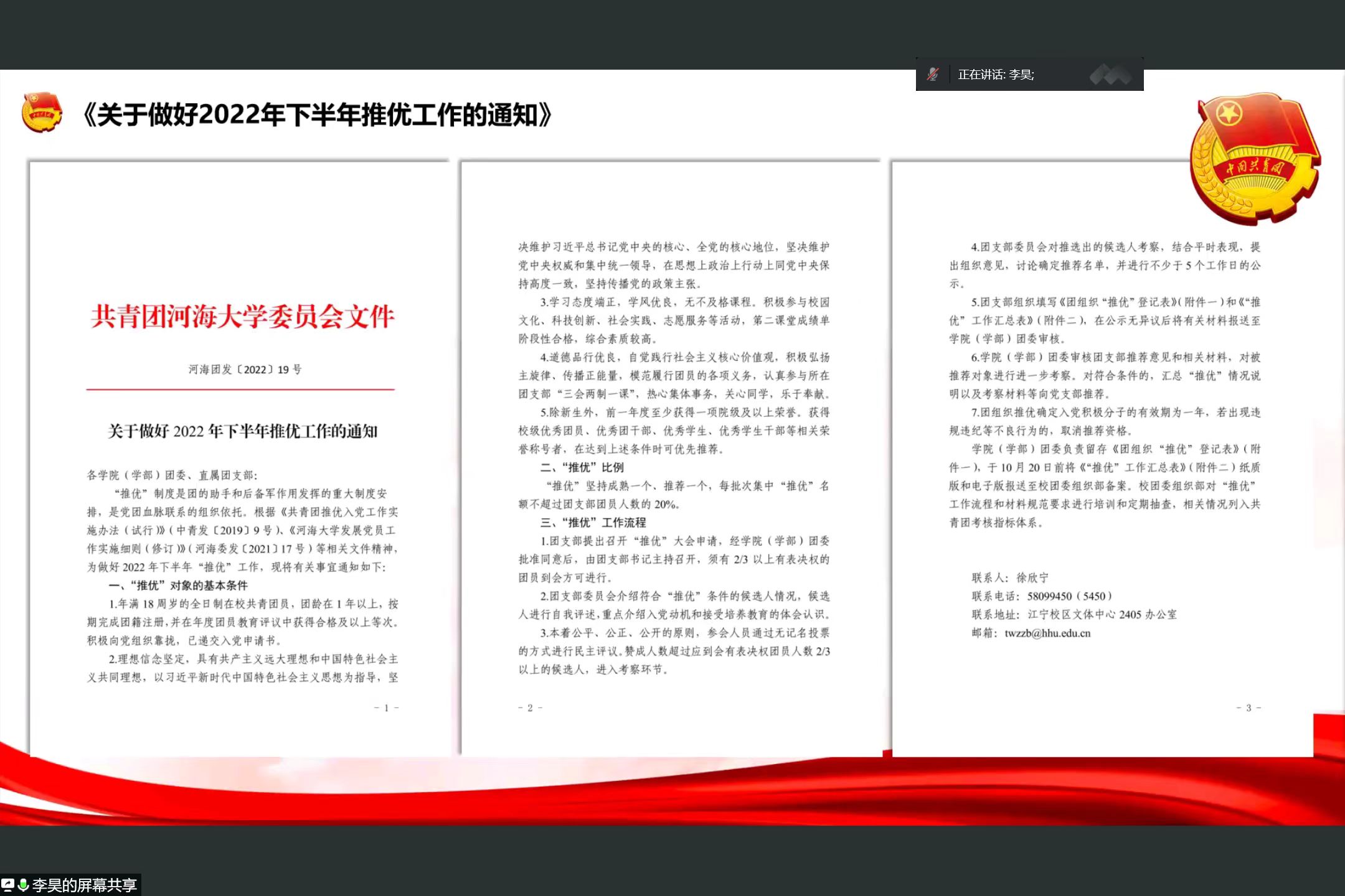 2022年10月6日,澳门六合彩 组织员朱钰老师和团委副书记李昊面向全体2022级本科生就党团员发展工作做详细介绍,为进一步开展学生入党积极分子培养教育、学生党员发展和教育管理服务、指导学生党支部和班团组织建设等工作奠定基础。