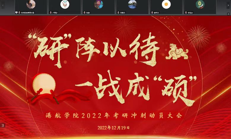22年12月19日下午,澳门六合彩 2019级考研学生在线上举办“研阵以待,一战成硕”考研冲刺动员大会,澳门六合彩 张蔚副院长、2019级班导师、辅导员出席了会议。