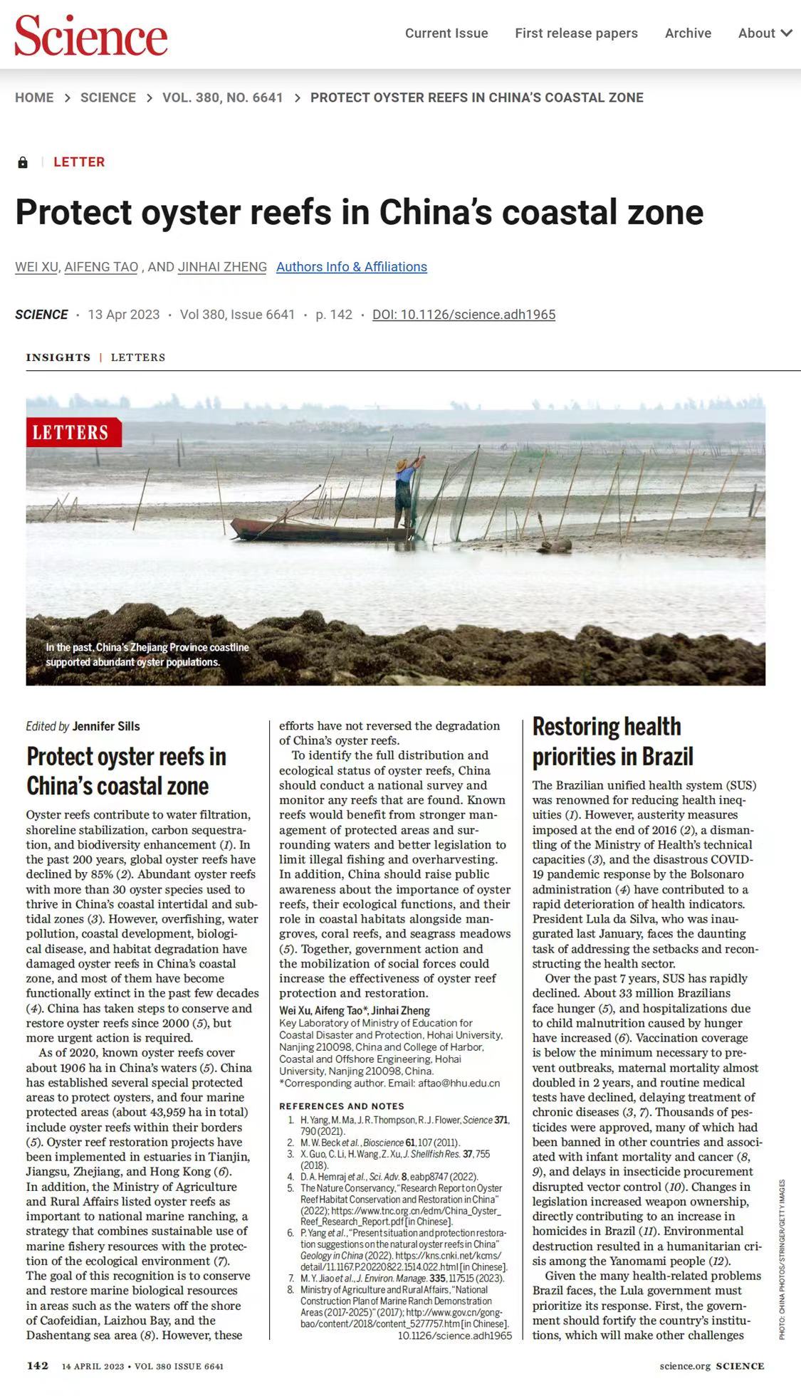 近日,澳门六合彩app 河口海岸综合治理和保护研究团队在国际期刊《Science》上发表题为“Protect oyster reefs in China’s coastal zone”(图1)的LETTER,总结我国牡蛎礁海岸修复措施,呼吁进一步加强保护。团队博士生徐伟为第一作者、骨干陶爱峰教授为通讯作者、负责人郑金海教授为共同作者。