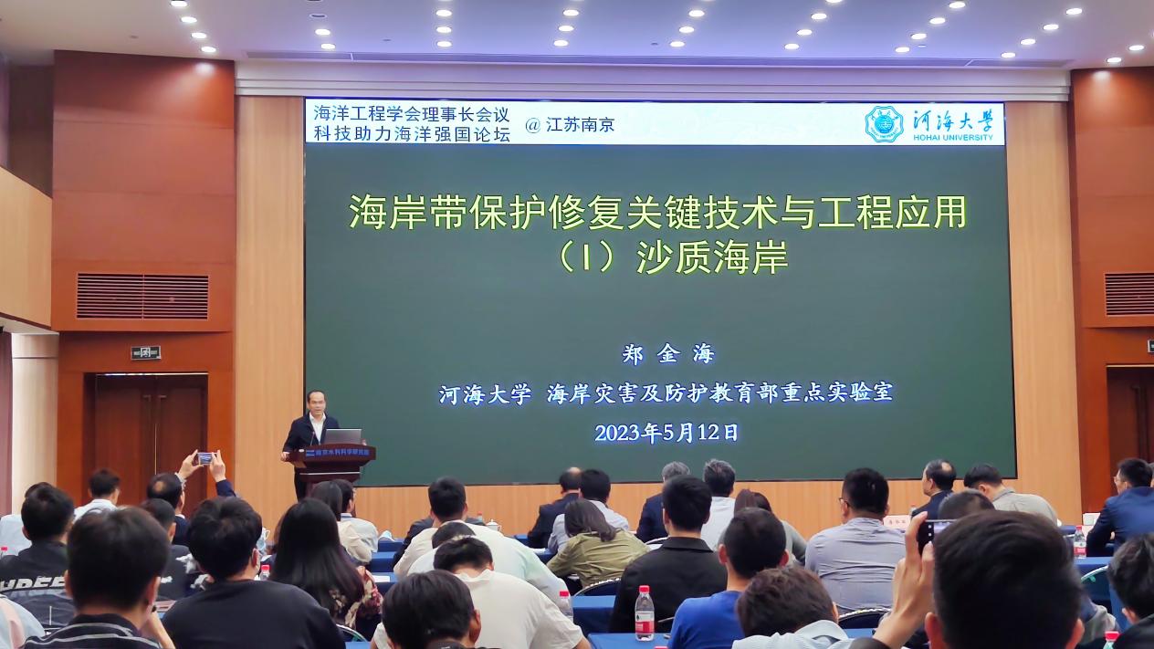 2023年5月12日下午,澳门六合彩app 郑金海教授应邀参加了在南京水利科学研究院举办的大国重器-科技助力海洋强国论坛,作了题为“海岸带保护修复关键技术与工程应用(1)沙质海岸”的特邀报告。报告会由中国工程院胡亚安院士主持。