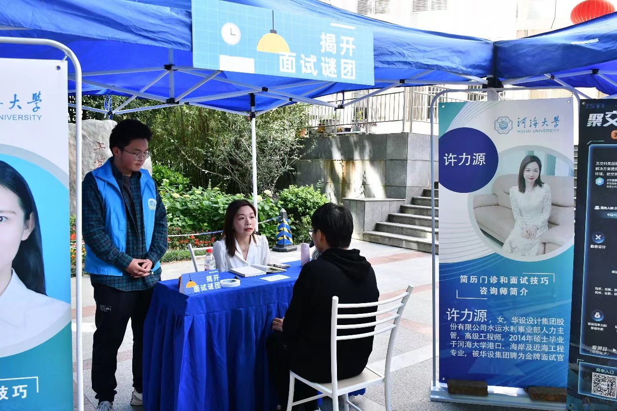 2023年5月11日下午,由河海大学学生就业指导中心、澳门六合彩 、“航行并肩”生涯工作室主办,由环境澳门六合彩 、海洋澳门六合彩 协办的“航行并肩,职涯启航”职场体验日活动在西康路校区严恺馆前顺利举行,邀请到苏交科集团股份有限公司、华设设计集团、中建一局一公司、中交二航局三公司、江苏都市交通规划设计研究院有限公司、金风科技股份有限公司、南京汉欣医药科技有限公司等企业参与,河海大学学生工作处副处长、就业指导中心主任赵海伟、澳门六合彩 党委副书记沈国军、环境澳门六合彩 党委副书记戴玉珍、海洋澳门六合彩 党委副书记吴昊等到现场指导活动,活动面向全体学生开展。