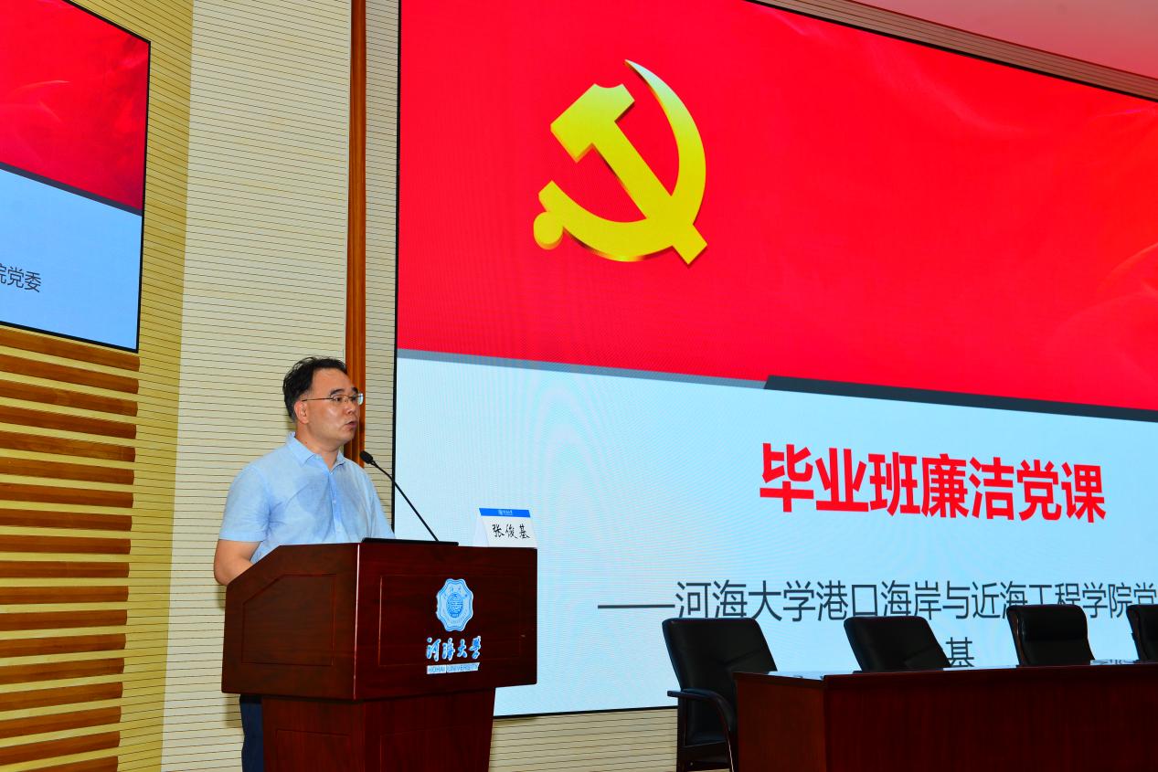 根据学习贯彻习近平新时代中国特色社会主义思想主题教育安排,在2023届毕业生走向人生新征程之际,6月19日,澳门六合彩 党委书记张俊基在闻天馆108为全体毕业生党员讲授廉洁党课,副书记沈国军主持。