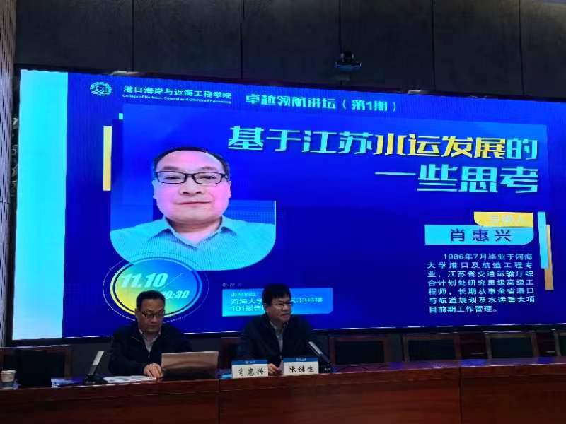 11月10日上午10:30,卓越领航讲坛第1期在常州校区33号楼101报告厅举行。澳门六合彩 特邀江苏省交通运输厅综合计划处研究员级高级工程师肖惠兴带来主题为《基于江苏水运发展的一些思考》的讲座。本期讲座由澳门六合彩 副院长张继生教授主持。