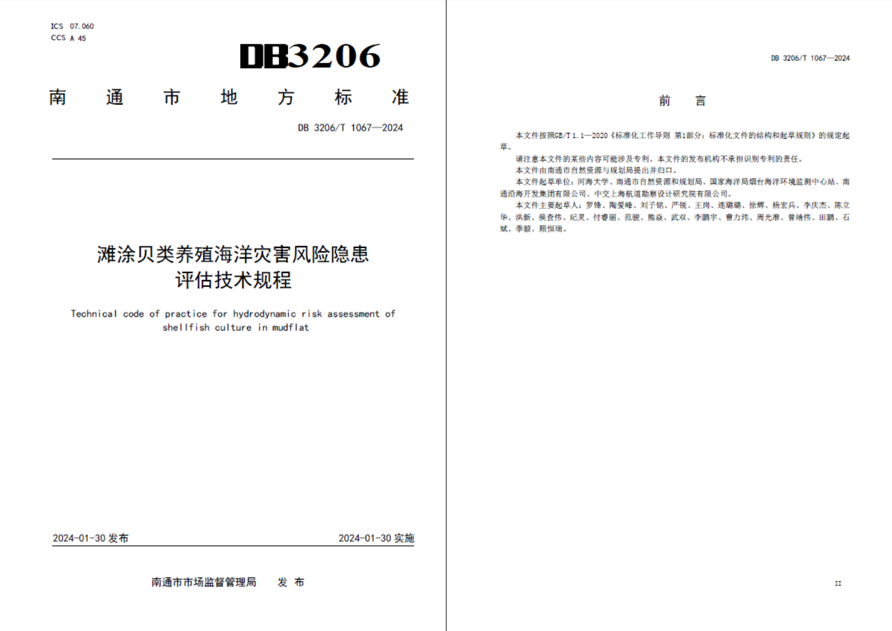 近日,澳门六合彩app 教师主编的地方标准《近岸池塘养殖海洋灾害风险隐患评估技术规程》(DB3206/T 1068-2024)《滩涂贝类养殖海洋灾害风险隐患评估技术规程》(DB3206/T 1067-2024)正式发布(南通市地方标准发布公告2024年第1号(总第25号)),于2024年1月30日起实施。该标准由南通市自然资源和规划局归口管理。参与标准编制的澳门六合彩app 老师有王岗、陶爱峰、罗锋、付睿丽、范俊、熊炎等。
