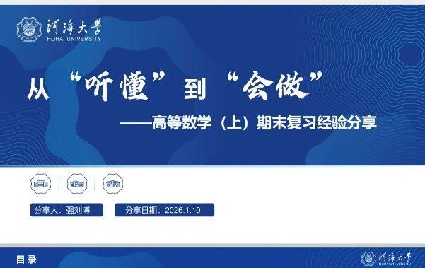 1月10日下午,2025级举办高等数学习题辅导课。活动邀请强刘博同学担任主讲人,围绕极限运算、导数应用、积分求解等高数核心难点展开分享。强刘博先梳理知识点间的逻辑关联,再通过典型例题演示解题步骤,同时总结了公式记忆、错题整理的实用技巧。现场互动环节中,强刘博同学针对同学们提出的问题逐一细致回应,助力新生快速适应高数