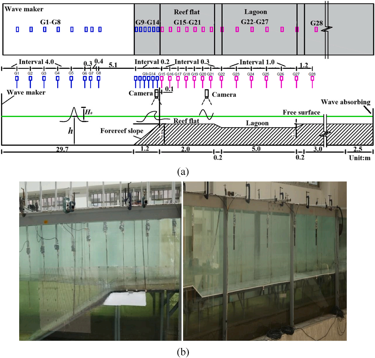 图1 试验波浪水槽及礁坪潟湖模型布置示意图