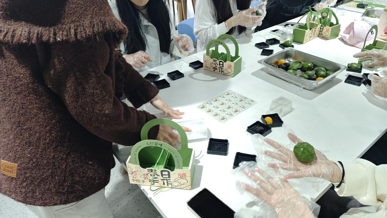上午10点半,参与同学齐聚三食堂三楼,食堂工作人员提前备好青团食材、包装盒、手套等各类材料。活动正式开始后,同学们先动手折叠包装盒,搭配小挂件完成精美包装制作,随后开启青团手作环节。