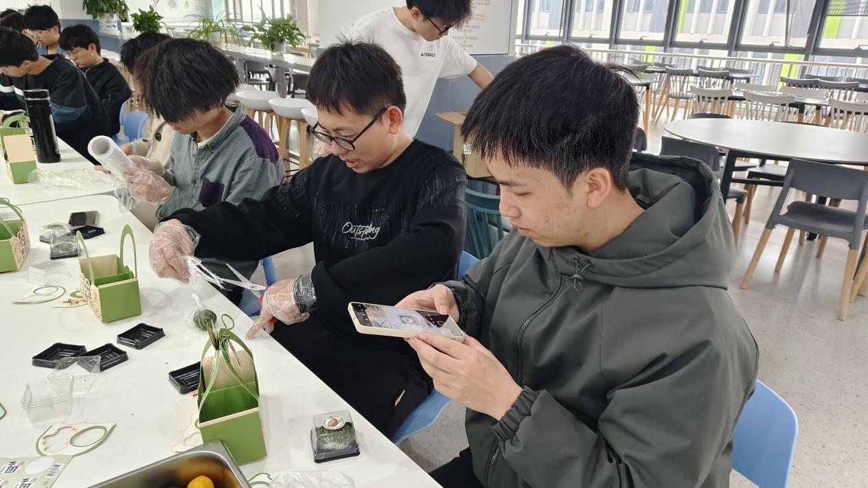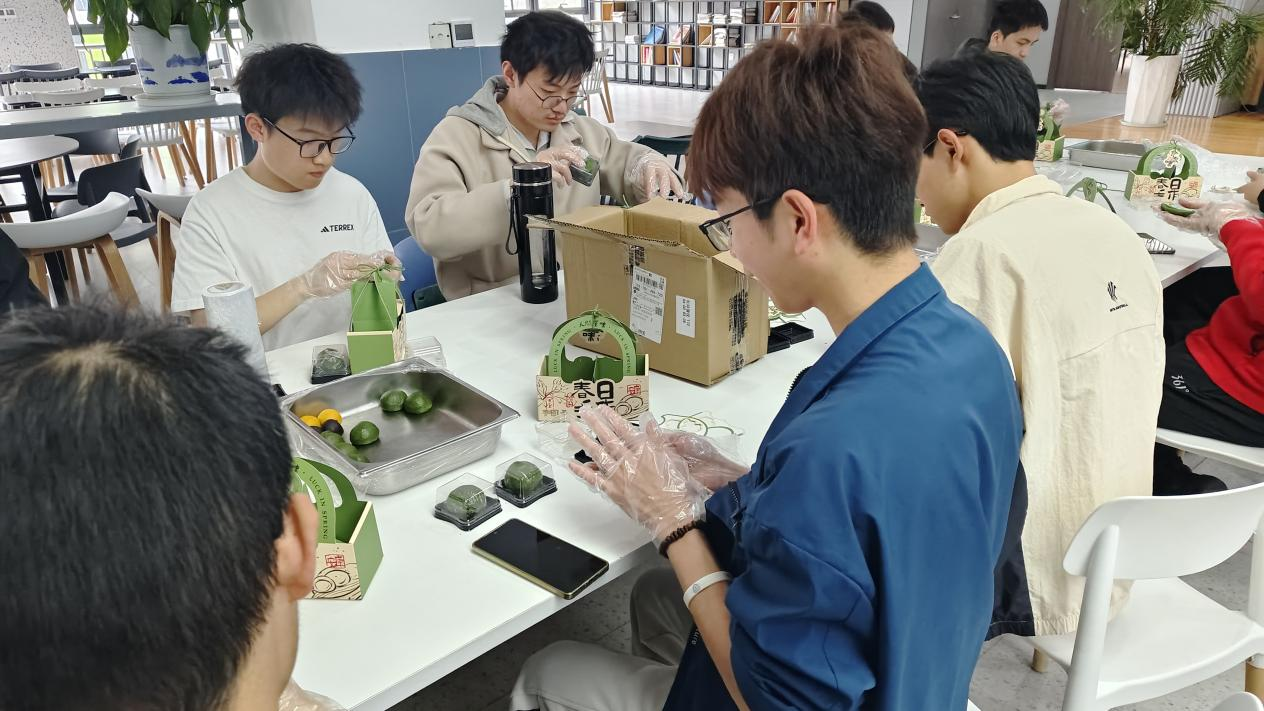 大家拿起软糯的艾草青团皮,按需填入金黄沙、红豆沙两种馅料,细心包裹、搓揉成型,一个个翠绿圆润的青团陆续诞生。完成制作后,同学们将青团装入小黑盒,贴上装饰贴纸,再放入自制礼盒中,整套流程井然有序。现场氛围轻松欢快,同学们互帮互助,尽情体验手工制作的乐趣。